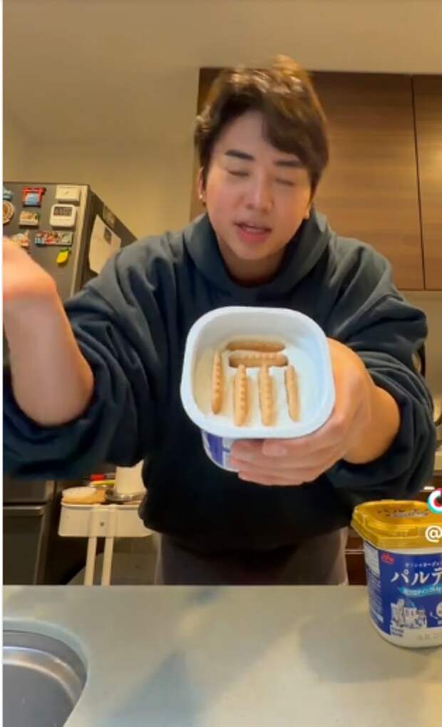 Тренд задали блогеры из Японии. В соцсетях Страны восходящего солнца появилось множество видеороликов, в которых пользователи в баночку греческого йогурта вертикально окунают французское печенье «сабле», похожее на песочное, и оставляют получившуюся смесь в холодильнике на ночь. Пользователи утверждают, что за это время печенье и йогурт смешиваются, приобретая вкус, похожий на чизкейк.